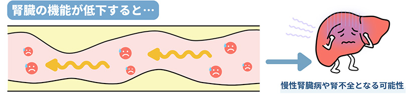 腎臓で酸素や栄養を運ぶ血管が傷つき、腎臓の機能が低下する慢性腎臓病へと進行し、重症化すると腎不全になる可能性もあります。