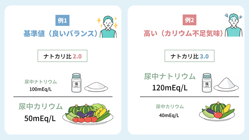 ナトカリ比は、病院での尿検査などで測定可能です。計算式は「尿中ナトリウム(mEq/L)÷ 尿中カリウム(mEq/L)」で求められ、高血圧予防・改善のための理想値(目安)は2.0以下です。