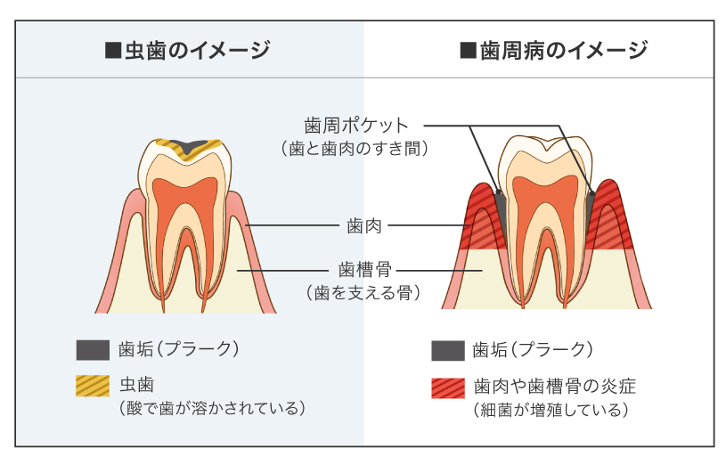 虫歯と歯周病の違いをきちんと理解している人は、意外と少ないかもしれません。以下は虫歯と歯周病のそれぞれのイメージ図です。